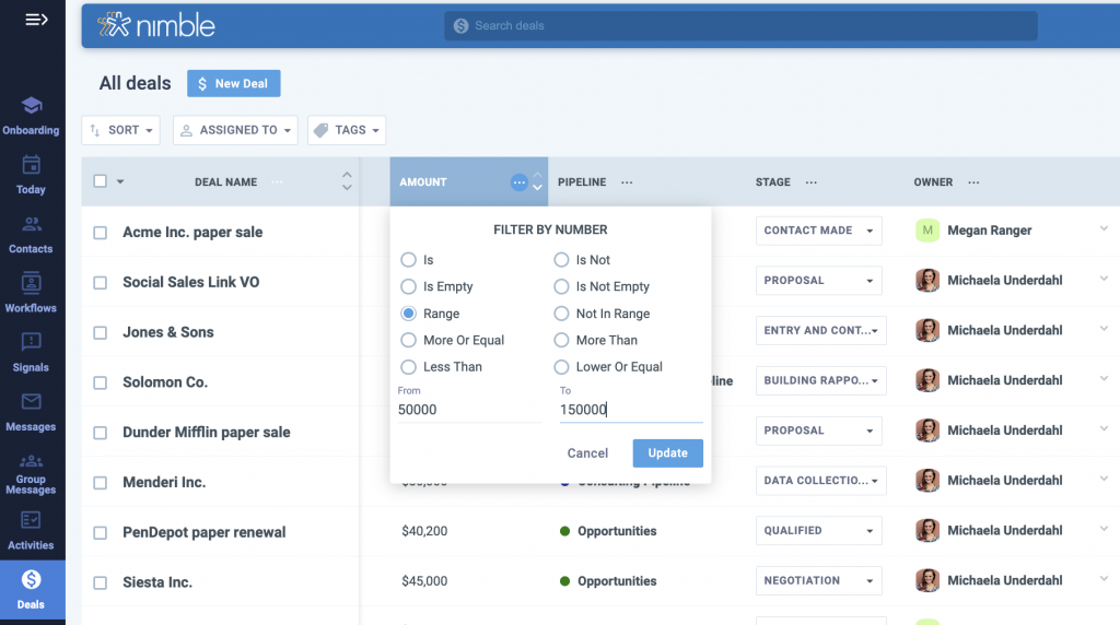 Nutshell allows users to save advanced filters to repeat searches later. This is especially useful for: