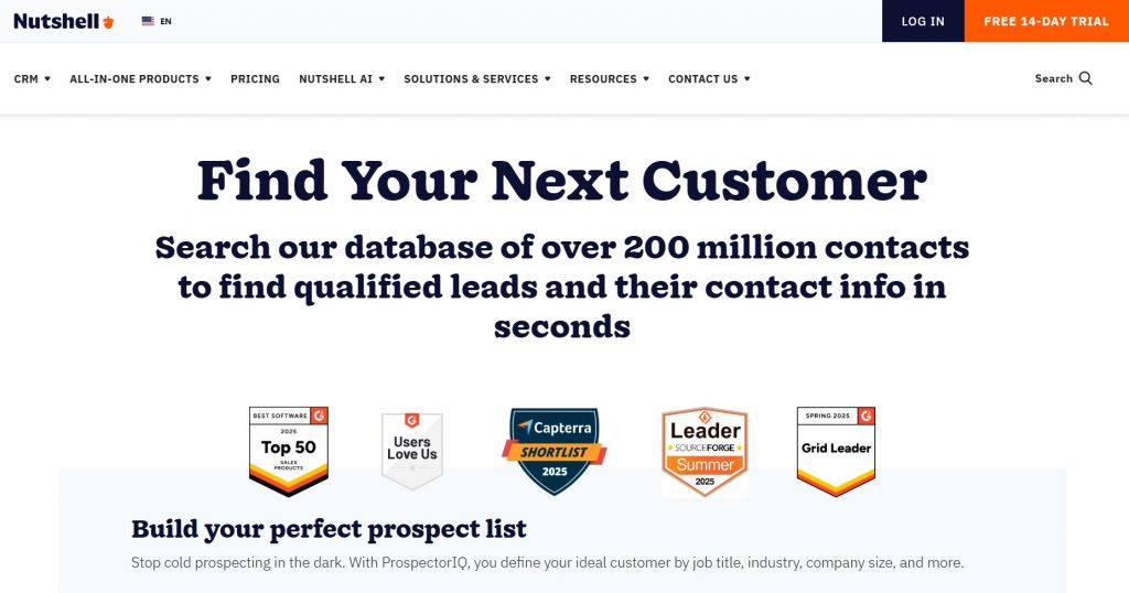 Nutshell is a powerful CRM that becomes even more valuable with ProspectorIQ, an add-on that includes access to a database of over 200 million verified contacts. This makes it one of the most comprehensive prospecting tools in 2025.