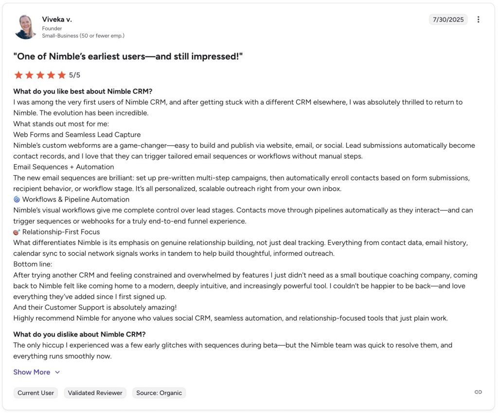 By reducing fragmentation, Nimble allows sales teams to focus on execution rather than tool coordination, which is often the difference between a stack that looks good on paper and one that actually performs.