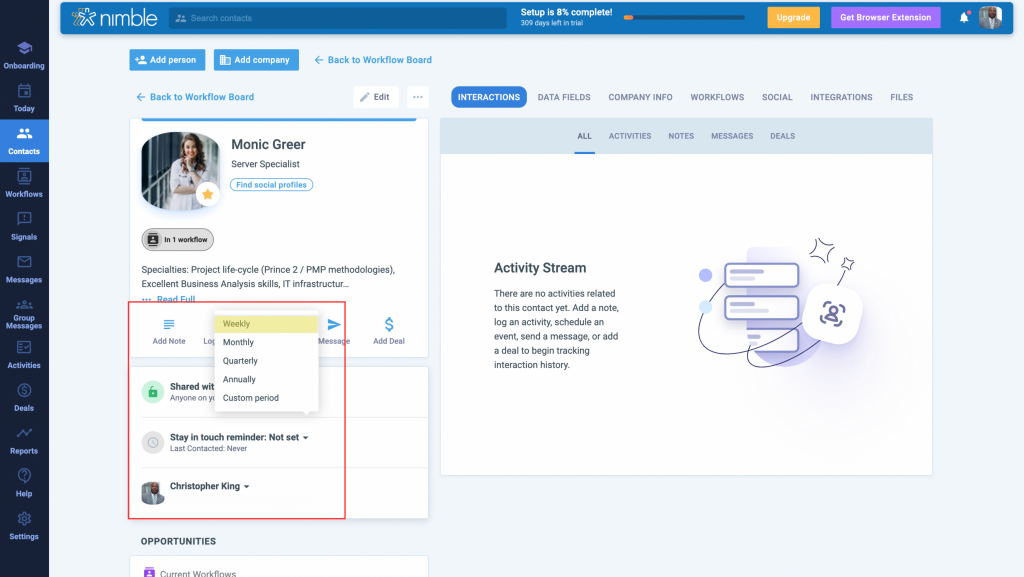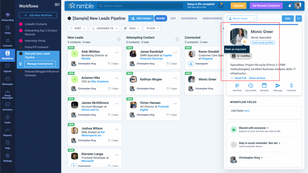 With the assistance of Nimble, King can efficiently prioritize his efforts and maintain regular communication with key contacts. The reminders ensure that he stays on top of his relationship-building activities, allowing him to connect with intent and nurture important connections effectively.