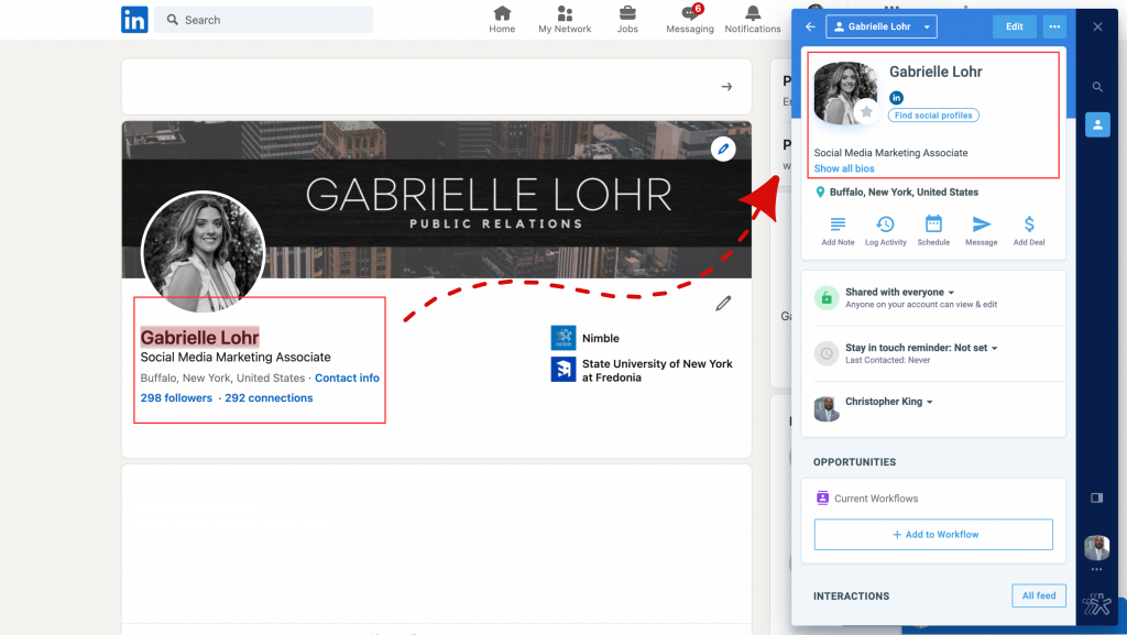 Nimble Prospector has revolutionized the way King outreaches to potential clients and connections. One of Nimble Prospector’s stand-out features is it’s capability to automatically populate contact information. King particularly appreciates this and says, “I love that I don’t have to fill out the bio and all of those things because Nimble does it for me.” Nimble’s automation capabilities eliminate the need for manual data entry, saving King from the tedious task of filling out bios and other details.