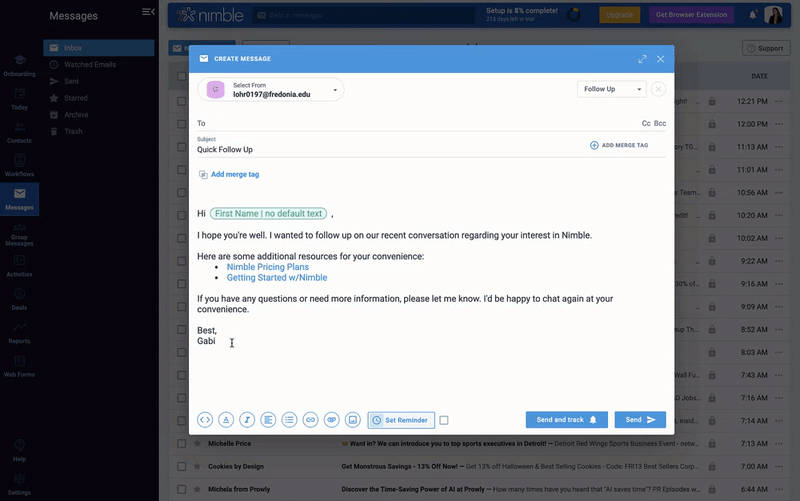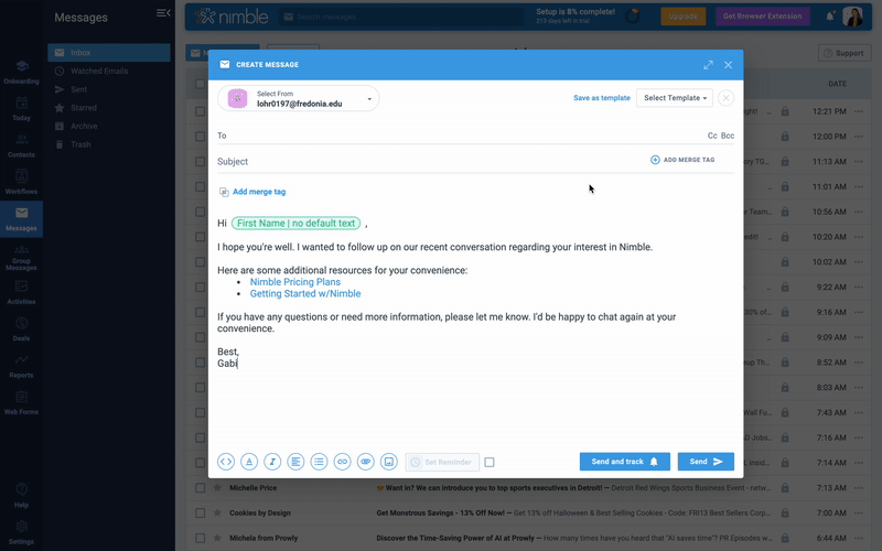 Balancing Automation with Personalization: While email templates offer the advantage of time-saving automation, it’s essential to strike a balance by adding a personal touch to your messages when needed. Nimble’s templates provide the flexibility to tailor messages for specific recipients by utilizing Merge Tags. This personalization ensures that your emails resonate with individual clients, partners, or colleagues, enhancing the effectiveness of your communication.
