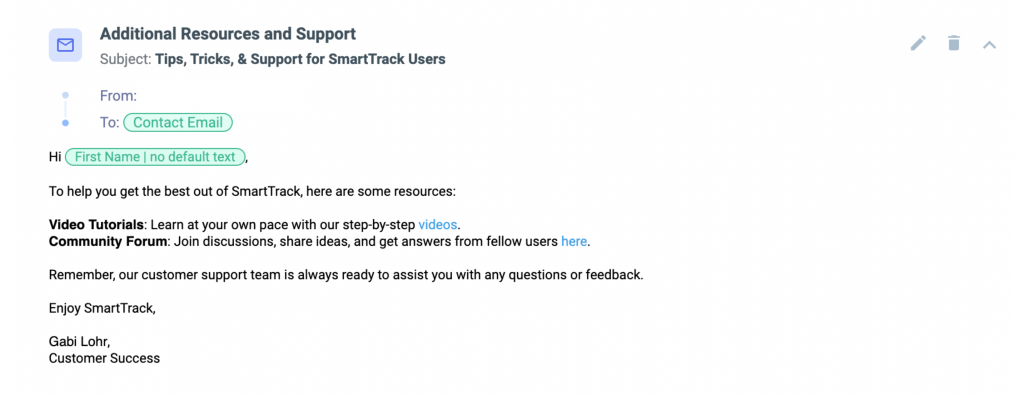 For example, the first email could welcome them and offer an overview of the product, followed by subsequent emails that address common beginner questions and how to get support.