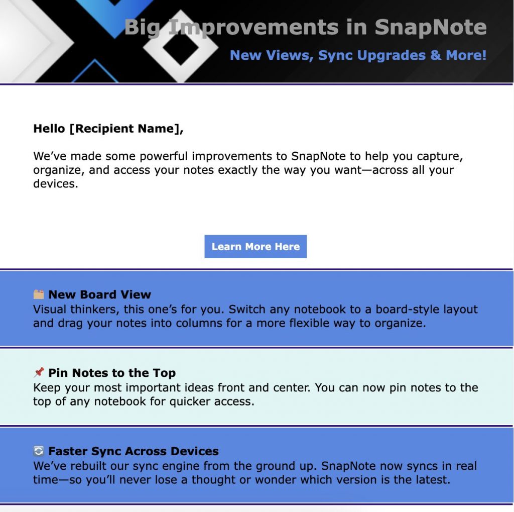 And here’s the best part—email templates are now available to everyone, no email marketing upgrade required! This means all Nimble users have access to these time-saving templates, whether you’re just starting with email marketing or you’re a seasoned pro.