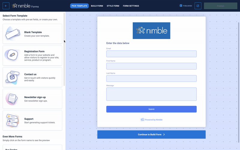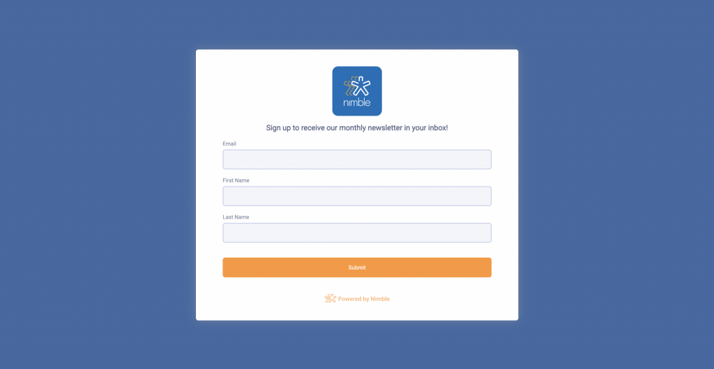 Diversity and utility are at the core of Nimble’s Web Forms, offering an array of templates to cater to various business needs. Whether you’re aiming to engage your audience through newsletters, provide stellar customer support with dedicated forms, encourage inquiries through contact forms, or facilitate smooth registration processes, we offer pre-built forms to meet your needs. As we continue to expand our template offerings, you can look forward to even more options tailored to your specific requirements.